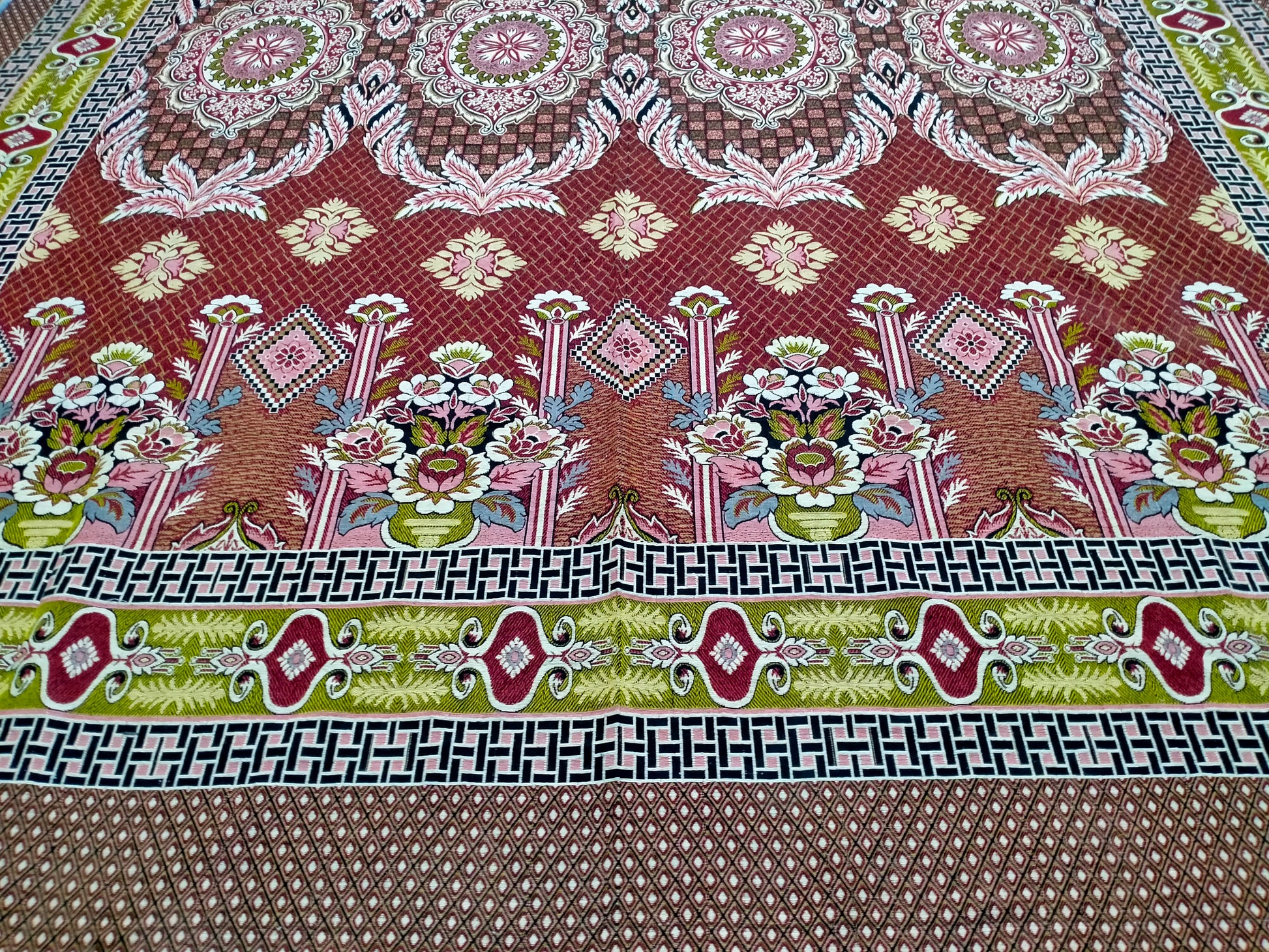 Crafted in the style of Multani Gultex bedsheets but made with heavy, durable fabric, this Traditional Multani Jazem – 9x11.5 Ft – Elegant Floral Classi features a classic geometric pattern that beautifully represents the heritage of Multani craftsmanship. Its elegant motifs and bordered layout bring a touch of timeless sophistication to any space.